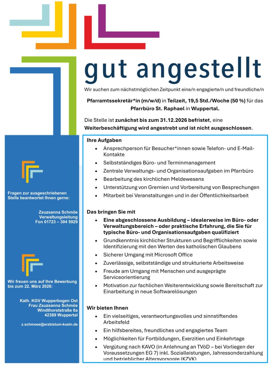 Aufgrund von personellen Engpässen müssen wir die Nachmittags-Öffnungszeiten in den Pfarrbüros vorübergehend anpassen. Zukünftig hat geöffnet: