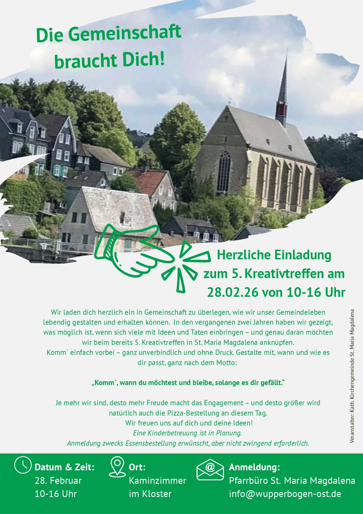 Eine herzliche Einladung zum 5. Kreativtreffen am Samstag, den 28. Februar von 10.00 bis 16.00 Uhr im Kaminzimmer des Klosters St. Maria Magdalena! Wir laden dich herzlich ein, in Gemeinschaft zu überlegen, wie wir unser Gemeindeleben lebendig gestalten und erhalten können. In den vergangenen zwei Jahren haben wir gezeigt, was möglich ist, wenn sich viele mit Ideen und Taten einbringen – und genau daran möchten wir anknüpfen. Komm´ einfach vorbei – ganz unverbindlich und ohne Druck. Gestalte mit, wann und wie es dir passt, ganz nach dem Motto: „Komm`, wann du möchtest und bleibe, solange es dir gefällt.“ Je mehr wir sind, desto mehr Freude macht das Engagement an diesem Tag. Wir freuen uns auf dich und deine Ideen! Eine Kinderbetreuung ist in Planung. Eine Anmeldung zwecks Pizzabestellung wäre erwünscht, aber nicht zwingend erforderlich.