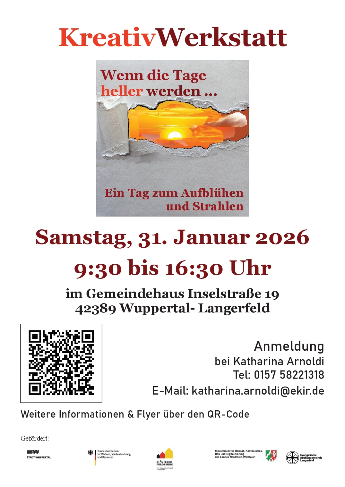 Unter dem Motto „Wenn die Tage heller werden“ lädt die ev. Kirchengemeinde Langerfeld zu einem Kreativtag ein, am Samstag, den 31. Januar von 09.30 bis 16.30 Uhr im Gemeindehaus Inselstraße! Workshops laden auf vielfältige Art und Weise ein, ins Staunen, Gestalten und in Bewegung zu kommen. Dabei ist genügend Zeit für Begegnungen und Austausch. Flyer liegen in den Kirchen aus!