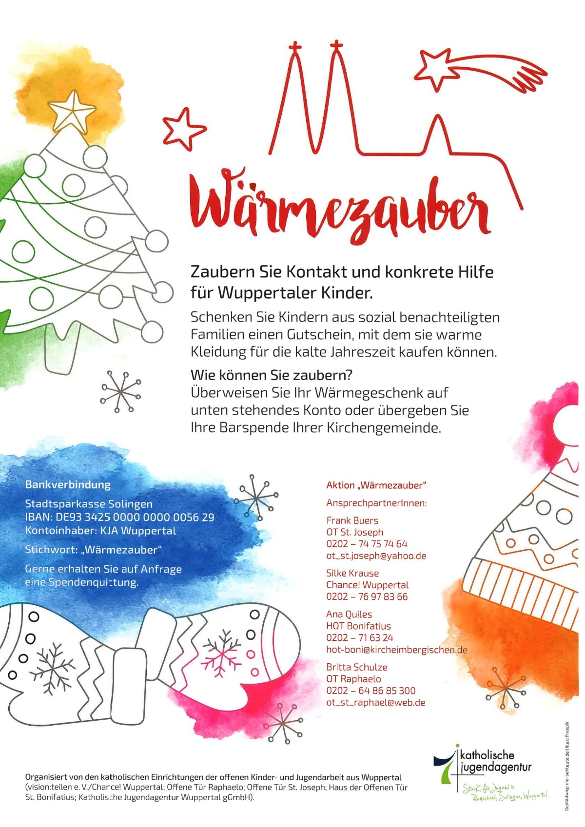 Wärmezauber, das ist der Name einer Aktion der katholischen offenen Jugendeinrichtungen, der OT Raphaelo und des Haus des Teilens in Wuppertal, die sich gegen Kinderarmut in unserer Stadt wenden. Ein Drittel aller Wuppertaler Kinder, lebt an oder unter der Armutsgrenze. Gerade in der Weihnachtszeit ist dies besonders auffällig. Hinzu kommen die Kinder hier in Wuppertal, die aus Kriegsgebieten zu uns geflüchtet sind. Auch diese möchten wir mitbedenken. Mit Ihren Spenden sollen in der Weihnachts- und Winterzeit Kinder und Jugendliche aus sozial benachteiligten Familien mit Einkaufs-gutscheinen für Bekleidungsgeschäfte (Wert jeweils 40,00€) beschenkt werden. Wenn auch Sie ein „Wärmezauberer“ werden möchten und wir möglichst vielen Kinder und Jugendliche helfen können, freuen wir uns über Ihre Spende. Dazu haben Sie bis zum 30. Dezember zwei Möglichkeiten:
