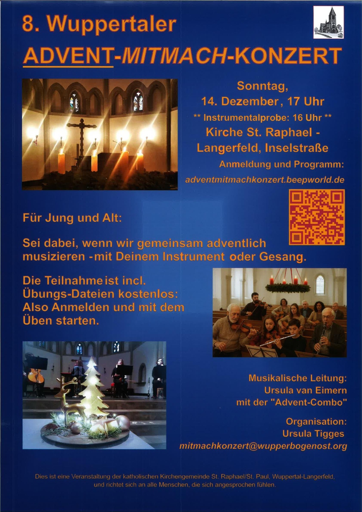 Am Sonntag, 14. Dezember findet um 17.00 Uhr im Seelsorgebereich Wupperbogen Ost in der Kirche St. Raphael das 8. Advent-Mitmach-konzert  statt.   Es  werden  gemeinsam